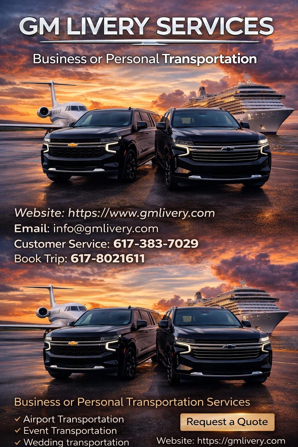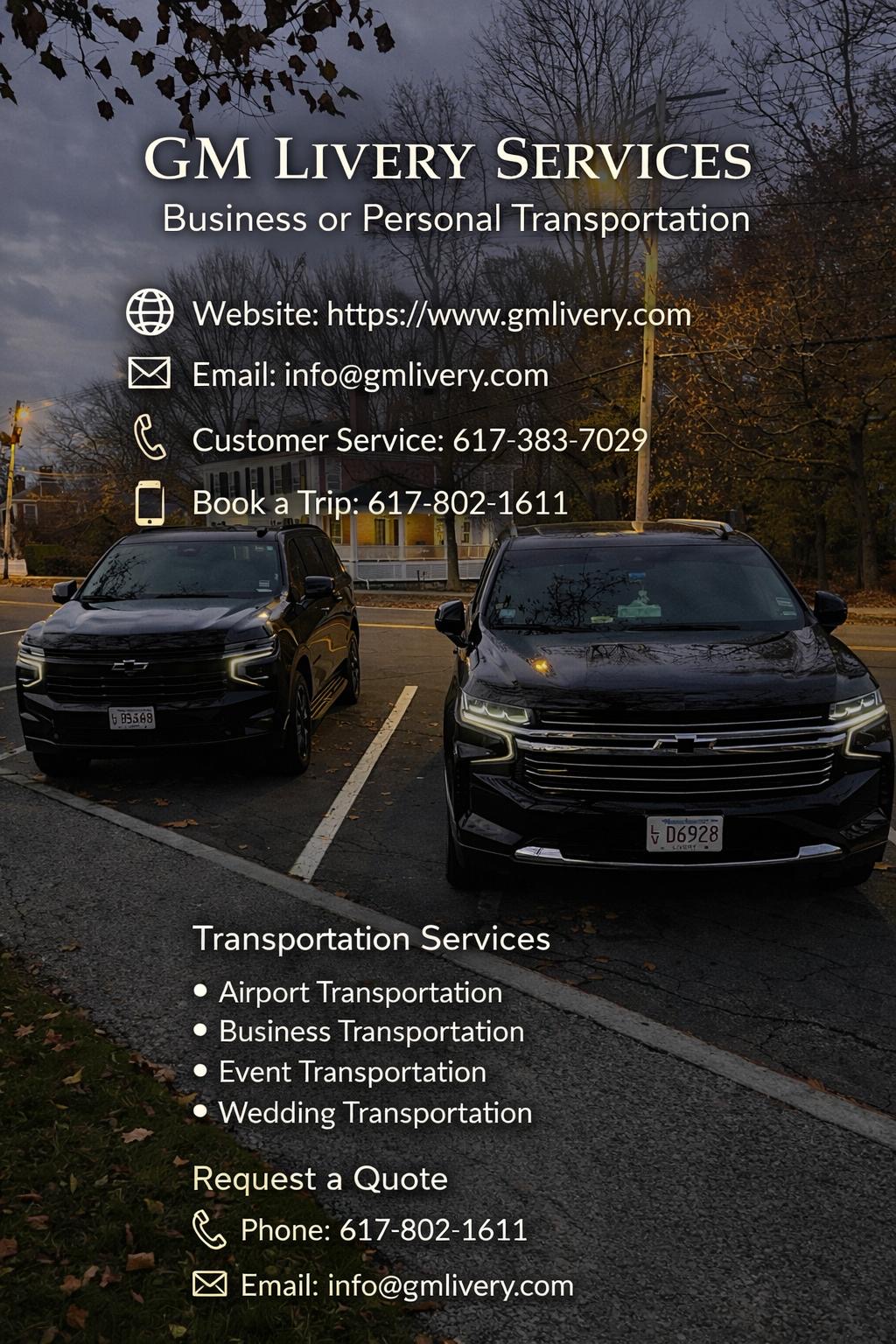 For bookings or additional information about events — including long‑distance trips and rides outside the state of Massachusetts—please contact us at info@gmlivery.com or call us at (+1) 617 802 1611. Our team is here to assist you with all your transportation needs.